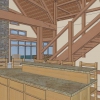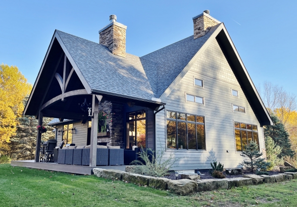 When we met Ron and Melissa at a trade show, we immediately hit it off. They were excited to be searching for someone to design their new forever home and their energy was inspiring. After discussing the desires for their home in great detail, Project Design Manager Tim Crowley told them that they really didn’t need to go to the other booths at the trade show because their search for a designer was over. Everyone laughed, but they noted that since they were there, they might as well check out our competition. Needless to say, about an hour later they came back and said, “You were right!”. The design process moved quickly and we created the plans together for what would become a work of art. Our partners at Heavy Timber Truss & Frame were part of the team. They helped bring the plans alive by aiding in the design and then manufacturing the massive oak timbers for the interior, the stately western red cedar timbers for the exterior and the structurally insulated panels (SIPs) for the walls and roof of the home. We even got to spend several days onsite during the timber raising and installation of the SIPs. One highlight was watching Ron pound in the first wood pegs into the mortise and tendon joinery! (Click here to watch a video of this exciting moment) At a visit to the completed home Ron and Melissa couldn’t say enough about how delighted they were with the whole process and the amazing results. They noted: “You designed for us a great home that was even better than we expected. You were there every step of the way making the process enjoyable & fun. We have already recommended you to friends!”
